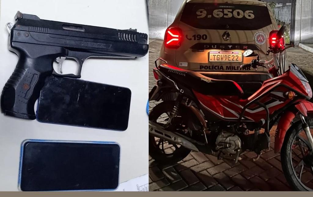 Com eles, a polícia encontrou um simulacro de pistola e dois celulares que haviam sido roubados de vítimas mediante grave ameaça. Além disso, a motocicleta utilizada pela dupla apresentava restrição de furto/roubo.
